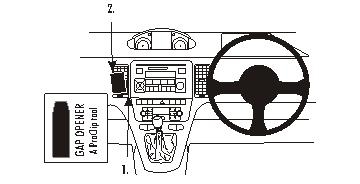 1. Das dünne Ende des beiliegenden "Gap Opener" zum Aufweiten in den Spalt zwischen dem Lüftungsgitter-Rahmen und dem Armaturenbrett drücken. Die mit Nut versehene Kante am rechten Ende des ProClip in den Spalt über den "Gap Opener" drücken. Den "Gap Opener" herausziehen.