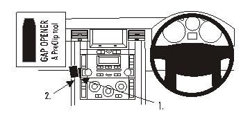 2. Das dünne Ende des beiliegenden "Gap Opener" zum Aufweiten in den Spalt zwischen dem Armaturentafel-Rahmen und dem Armaturenbrett drücken, wie im Bild gezeigt. Die linke Seite des ProClip nach vorne drücken, so dass sich die angewinkelte Kante in den Spalt festhakt. Den "Gap Opener" herausziehen.