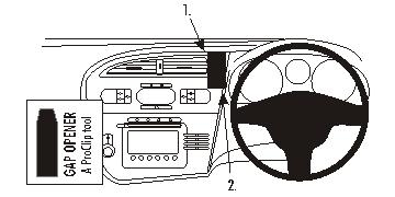 3. Den "Gap Opener" in den Spalt zwischen der Armaturentafel und dem Armaturenbrett drücken. Das untere Ende des ProClip in den Spalt über den "Gap Opener" drücken. Den "Gap Opener" herausziehen.