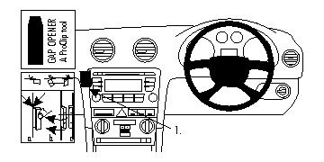 1. Das dünne Ende des beiligenden "Gap Opener" zum Aufweiten in den Spalt zwischen dem Rahmen um das Autoradio und dem Armaturenbrett drücken.