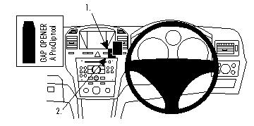 1. Die Oberfläche wo der ProClip montiert werden soll, mit dem beiliegenden Alkohol-Pad reinigen. Das dünne Ende des beliegenden "Gap Opener" zum Aufweiten in den Spalt zwischen dem Rahmen um die Armaturentafel und der Blende um das Display drücken. Die Schutzfolie vom Klebestreifen am ProClip entfernen. Die linke Ecke der oberen Kante des ProClip in den Spalt neben den "Gap Opener" drücken.