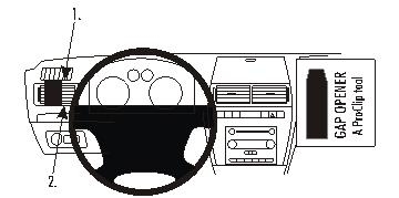 1. Das dünne Ende des beiliegenden "Gap Opener" zum Aufweiten in den Spalt neben dem Lüftungsgitter-Rahmen und dem Armaturenbrett drücken. Die Schutzfolie vom Klebestreifen am ProClip entfernen.