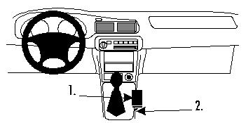 2. Das linke mit Klebestreifen versehene Teil des ProClip in den Spalt zwischen dem Rahmen um die Gangschaltung und dem Rahmen um die Armaturentafel bei Pos. 1 drücken