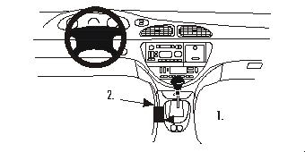 1 und 2. Den oberen Teil des ProClip in den Spalt zwischen der Konsole und der Tafel um die Gangschaltung drücken.