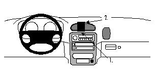 1. Die angewinkelte Kante am unteren Ende des ProClip in den Spalt zwischen der mit Holzmaserung versehenen Blende um dem Autoradio und dem Armaturenbrett plazieren.