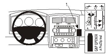 1. Das dünne Ende des beiligenden "Gap Opener" zum Aufweiten in den Spalt zwischen dem Armaturenbrett und dem umliegenden Rahmen drücken. Die Schutzfolie vom Klebestreifen am Teil 1 entfernen. Teil 1 in den Spalt unter dem "Gap Opener" drücken.