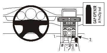 1. Das dünne Ende des beiliegenden "Gap Opener" zum Aufweiten in den Spalt in der Seitenwandt der Konsole drücken. Die Schutzfolie vom Klebestreifen am ProClip entfernen.