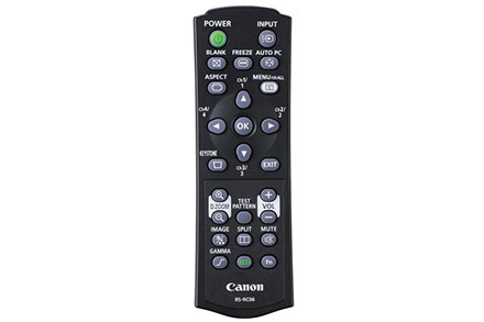 Canon RS-RC06. Schnittstelle: IR Wireless, Produktfarbe: Schwarz, Fernbedienung Nutzung: Projektor. Eingangssignal: Drucktasten
