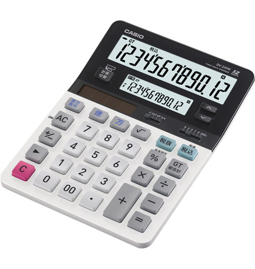 Casio DV-220. Formfaktor: Desktop, Typ: Display-Rechner, Produktfarbe: Schwarz, Weiß. Energiequelle: Batterie/Solar, Akku-/Batterietyp: LR44