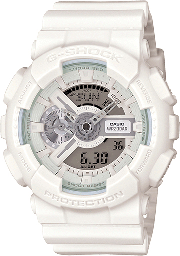 Casio GA-110BC-7A. Typ: Armbanduhr, Gehäusematerial: Harz, Gehäusefarbe: Weiß. Akku-/Batterietyp: CR1220, Batterie Lebensdauer: 2 Jahr(e)