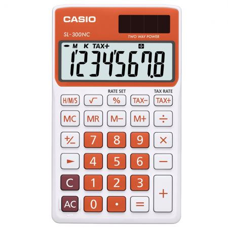 Casio SL-300NC. Formfaktor: Tasche, Typ: Display calculator, Produktfarbe: Orange. Kontrolltyp: Knöpfe. Speichermedien Typ: Not available. Energiequelle: Batterie/Solar, Akku-/Batterietyp: LR54. Breite: 70 mm, Tiefe: 118,5 mm, Höhe: 8 mm