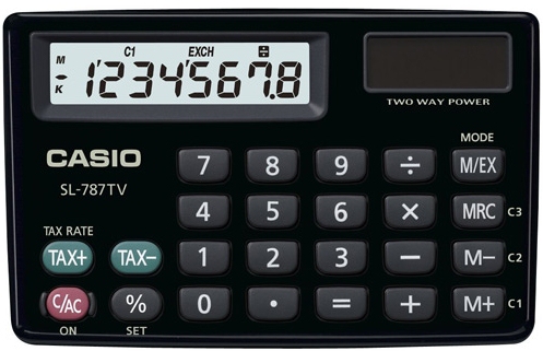 Casio SL-787TV. Formfaktor: Tasche, Typ: Display-Rechner, Produktfarbe: Schwarz. Ziffer-Komma-Trennzeichen-Format: Standard (3-stellig). Gewicht: 30 g, Abmessungen (BxTxH): 91,5 x 58 x 6,3 mm