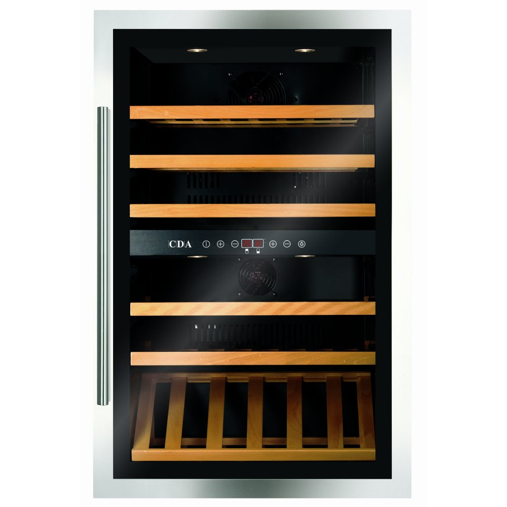 CDA FWV901. Bauform: Eingebaut, Gehäusefarbe: Edelstahl, Türfarbe: Edelstahl. Temperraturreichweite (Zone 1): 5 - 22 °C, Temperaturbandbreite (zone 2): 5 - 22 °C, Geräuschpegel: 44 dB. Energie-Effizienzklasse: B, Jährlicher Energieverbrauch: 195 kWh. Breite: 592 mm, Tiefe: 545 mm, Höhe: 884 mm