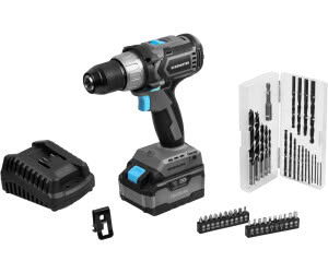 Lieferumfang: Bithalter, Netzteil, Schnellladegerät, Aufladestation, Akku, Gürtelclip, Anleitung, Bit-Set, Bohrer-Set
