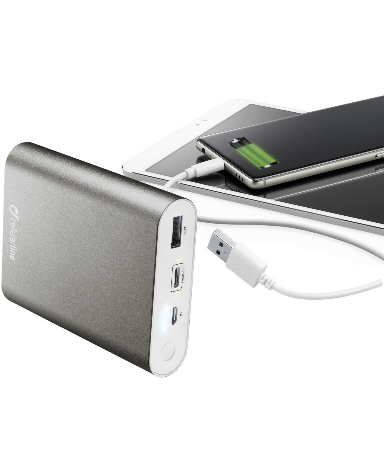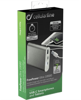 Cellularline FreePower Ultra 10000. Produktfarbe: Silber, Gehäusematerial: Aluminium, Aufladekompatibilität: Universal. Batterietechnologie: Lithium, Batteriekapazität: 10000 mAh, Aufladequelle: USB. Verpackungsbreite: 23 mm, Verpackungstiefe: 91 mm, Verpackungshöhe: 176 mm