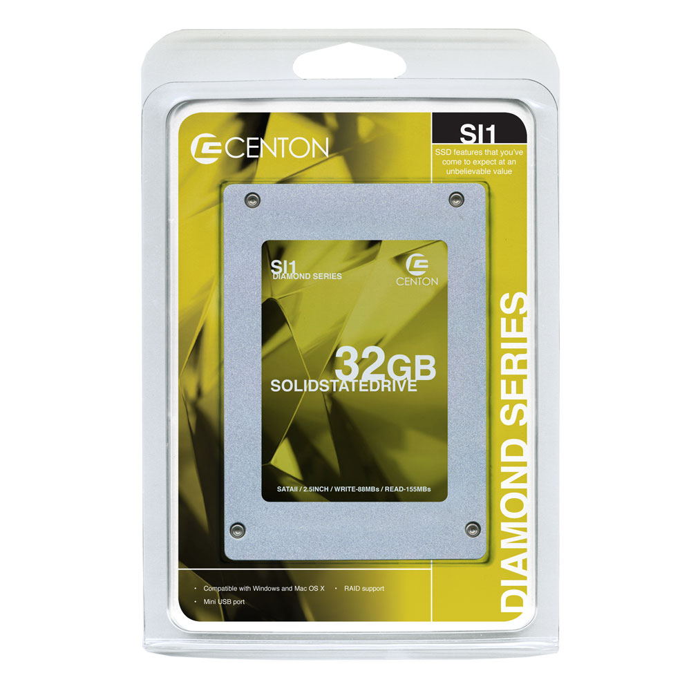 Centon 32GB SI1. Speichertyp: MLC. SSD-Formfaktor: 2.5", Produktfarbe: Silber, Zertifizierung: RoHS. Unterstützte Windows-Betriebssysteme: Windows 7 Home Premium, Windows 7 Professional, Windows 7 Ultimate, Windows Vista Business, Windows , Unterstützt Mac-Betriebssysteme: Mac OS X 10.0 Cheetah, Mac OS X 10.1 Puma, Mac OS X 10.2 Jaguar, Mac OS X 10.3 Panther, Mac OS X 10.. Verpackungsabmessungen (BxTxH): 102 x 25,4 x 127 mm