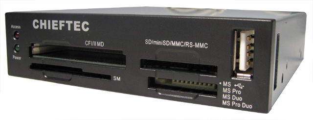 Chieftec CRD-151 3.5" 15in1 Multi Card Reader. Kompatible Speicherkarten: MS Duo. Abmessungen (BxTxH): 103 x 101 x 25 mm, Kompatible Betriebssysteme: Windows98/98SE/ME/2000/XP, Mac OS 9.x, Linux 2.4