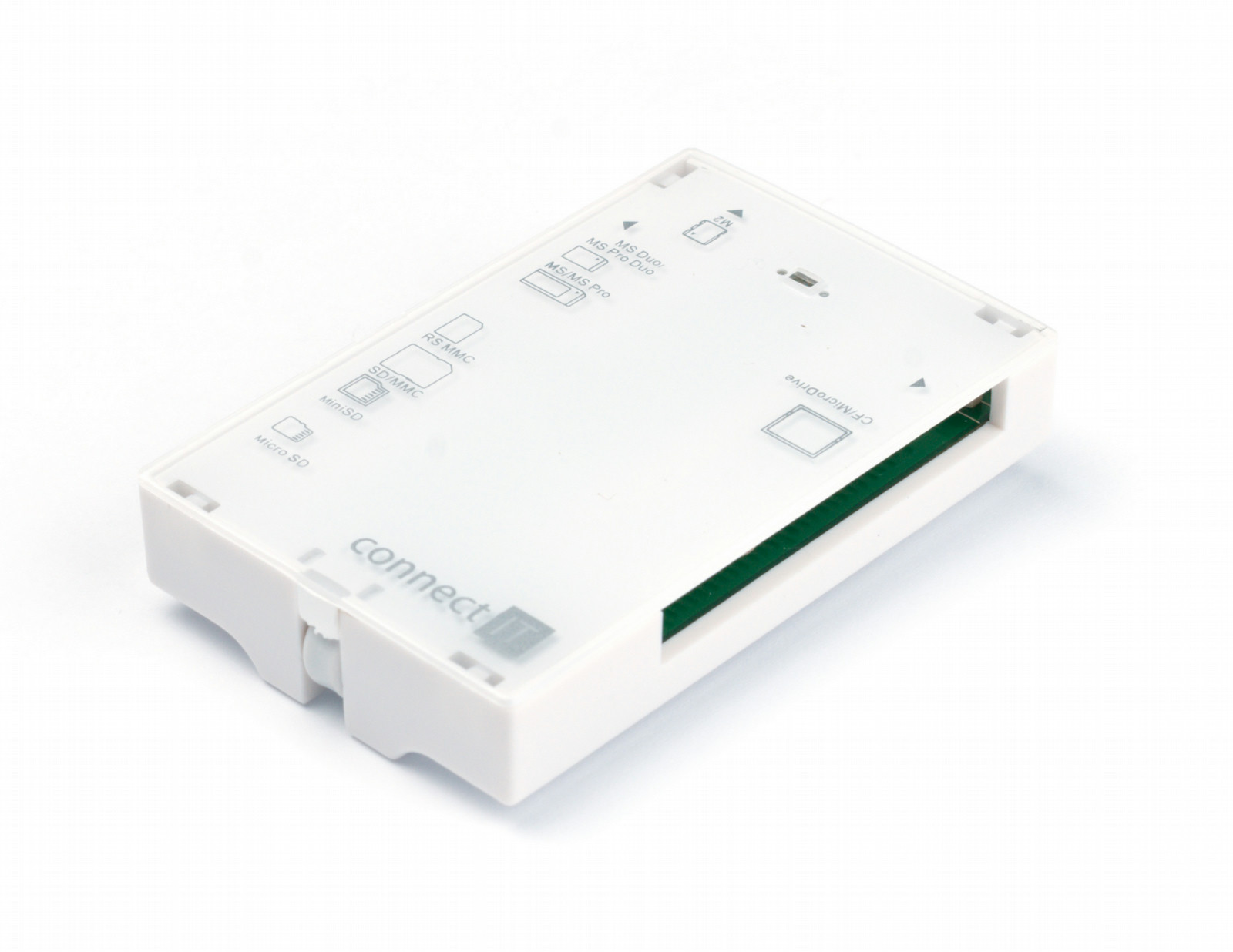 Connect IT CI-106. Kompatible Speicherkarten: CF, Speicherstick (MS), MicroDrive, microSD (TransFlash), microSDHC, miniSD, miniSDHC, MMC, MS Duo, . Schnittstelle: USB 2.0. Unterstützte Windows-Betriebssysteme: Windows 2000, Windows 7 Home Basic, Windows 7 Home Basic x64, Windows 7 Home Premium, Windows 7 Home, Unterstützt Mac-Betriebssysteme: Mac OS X 10.1 Puma, Mac OS X 10.2 Jaguar, Mac OS X 10.3 Panther, Mac OS X 10.4 Tiger, Mac OS X 10.5 . Produktfarbe: Weiß