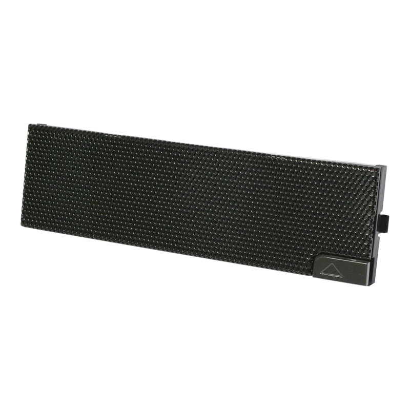 Die Blende ist aus schwarzem Kunststoff gefertigt und frontseitig mit einem Mesh-Gitter in Gehäuse-Optik versehen.