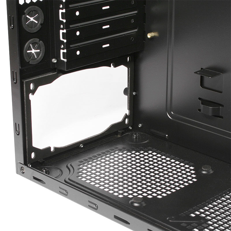 Das hochwertige Gehäuse verfügt über ein stabiles und sehr gut verarbeitetes Stahlchassis (0,6 mm) welches vollständig in schwarz lackiert ist. Sorgfältig gefalzte und entgratete Kanten bewahren vor Schnittverletzungen während der Hardware-Montage. Die Schnellverschlüsse für jeweils zwei 5,25 und 3,5 Zoll Laufwerke, sowie die Befestigung der Seitenteile mit Thumbscrews ermöglichen bei den meisten Systemen eine annähernd werkzeuglose Montage.