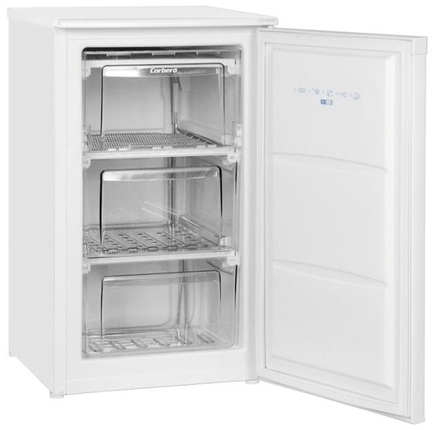 Corbero CCV850W. Bauform: Freistehend, Typ: Senkrecht, Produktfarbe: Weiß. Gefrierfach - Nettokapazität: 79 l, Gefriervermögen: 9 kg/24h, Lagerzeit bei Störung: 13,3 h. Energie-Effizienzklasse: A+, Energieverbrauch: 0,54 kWh/24h, AC Eingangsspannung: 220 - 240 V. Breite: 562 mm, Tiefe: 480 mm, Höhe: 838 mm