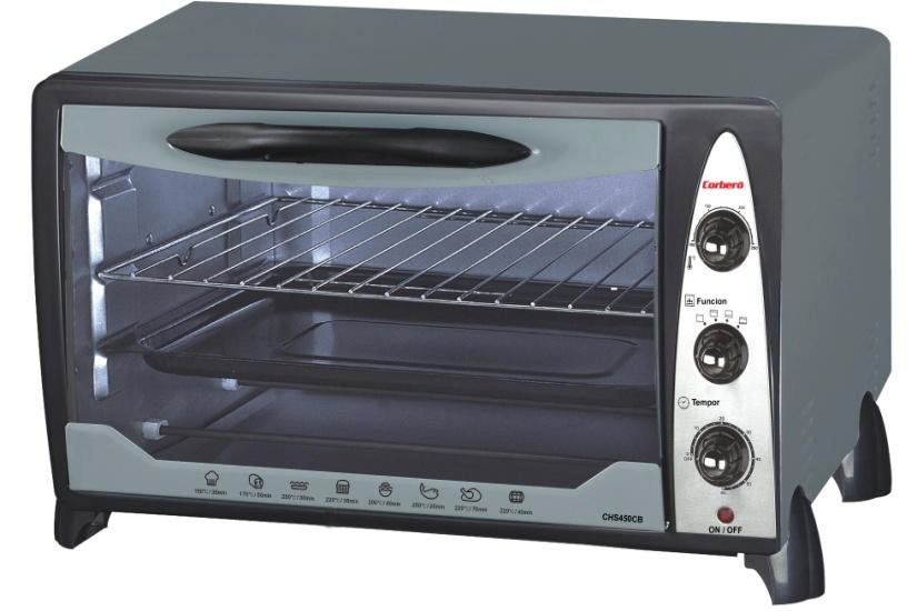 Corbero CHS 450 CB. Ofentyp: Electric oven, Gesamtes Fassungsvermögen Garraum Ofen: 45 l, Insgesamt Backofen Leistung: 1600 W. Produktfarbe: Schwarz, Edelstahl, Kontrolltyp: Rotation, Gehäusematerial: Edelstahl. Timer-Typ: Mechanisch. AC Eingangsspannung: 230 V, AC Eingangsfrequenz: 50 Hz. Breite: 380 mm, Tiefe: 630 mm, Höhe: 330 mm