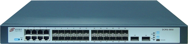 DCN DCRS-5950-26 - 10G IPv6 L3 Routing Switch. Switch-Typ: Managed network switch, Switch-Ebene: L3. MAC-Adressentabelle: 16000 Eintragungen, Routing-/Switching-Kapazität: 88 Gbit/s. Management-Protokolle: CLI, Telnet, SNMPv1/v2/v3, MIB, RMON 1/2/3/9. Stromverbrauch (typisch): 80 W. Datenübertragungsrate: 66 Mbit/s, Abmessungen (BxTxH): 440 x 420 x 44 mm, Übertragungstechnik: Verkabelt
