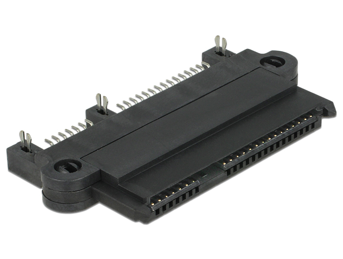 Dieser Steckverbinder von Delock eignet sich für SATA Festplatten und SSDs. Er kann in ein System integriert werden, zum Beispiel zur Nutzung von Wechselrahmen. Die patentierte NSS (= Non Scratch SATA) Technologie hat einen Federmechanismus an einer 22 Pin Seite integriert, welcher den Auswurf der Festplatte gewährleistet. Somit muss die Festplatte in einem Rahmen gesichert werden, da der Steckverbinder die Festplatte direkt auswerfen würde. Durch die NSS Technologie wird die Festplatte bei jedem Steckvorgang geschont, da ein Zerkratzen der Kontakte verhindert wird. Der 22 Pin Anschluss wird im 180° Winkel auf die Leiterplatte gelötet.
