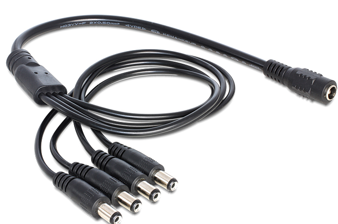 Dieses Delock Verteilerkabel dient zum Anschluss von vier Geräten, welche Kleinspannung benötigen, wie z. B. Kameras oder LED-Streifen an ein Netzteil mit DC Anschluss.