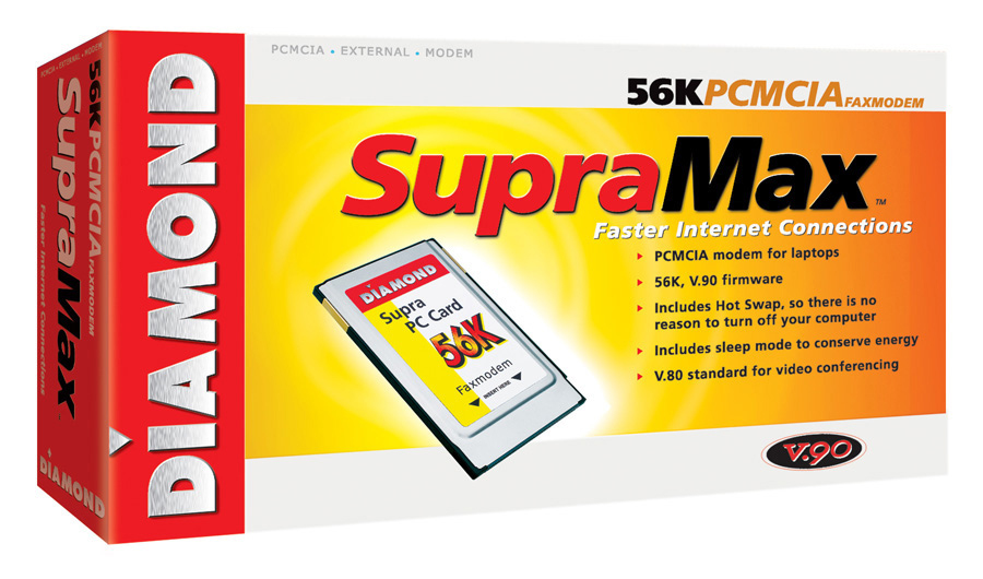 Diamond Multimedia SupraMax PCMCIA 56K Modem. Modemgeschwindigkeit: 56 Kbit/s, Schnittstelle: PCMCIA. Maximale Telefaxübertragungsrate: 14.4 Kbit/s. Mindestsystemvoraussetzungen: 6 MB HDD, Minimum Prozessor: AMD Athlon, Intel Pentium 4, 266 MHz, Min. benötigter RAM: 16 MB
