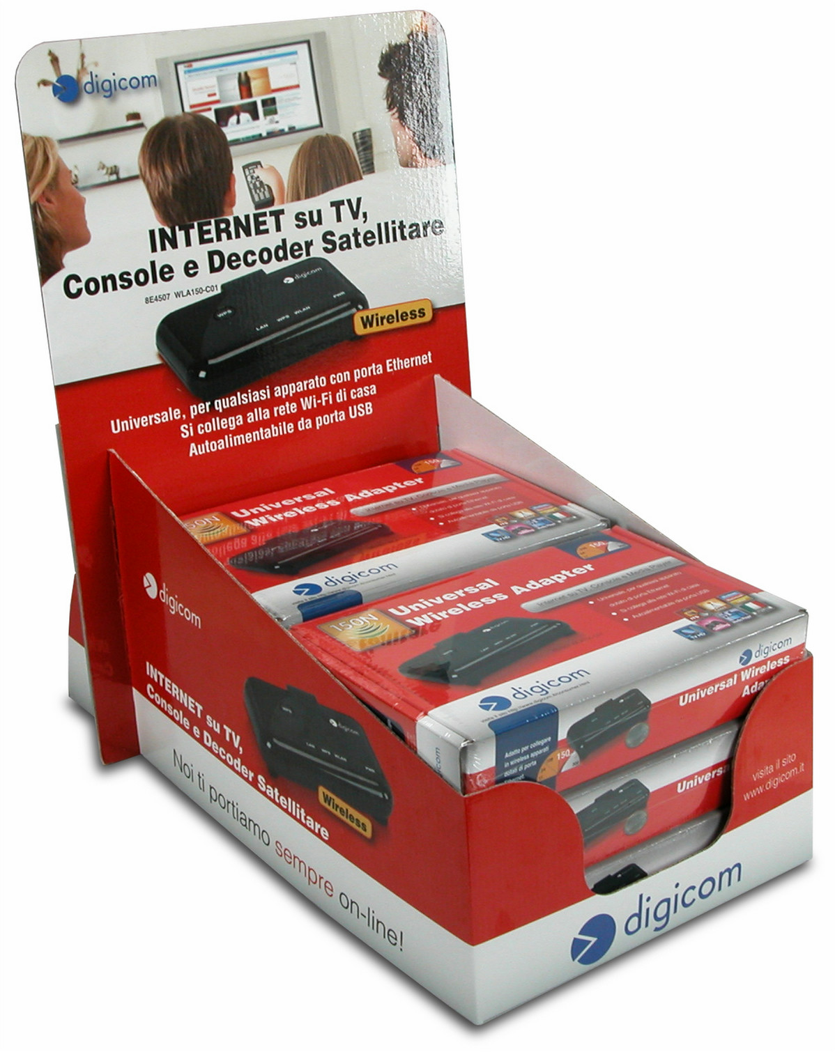 Digicom 8E4541. Übertragungstechnik: Verkabelt/Kabellos, Hostschnittstelle: Ethernet, Schnittstelle: WLAN. Verkabelungstechnologie: 10/100BaseT(X), Netzstandard: IEEE 802.11b, IEEE 802.11g, IEEE 802.11n, IEEE 802.3, IEEE 802.3u. Top WLAN-Standard: IEEE 802.11n, WLAN-Standards: IEEE 802.11b, IEEE 802.11g, IEEE 802.11n. Produktfarbe: Schwarz, LED-Anzeigen: LAN, Leistung, WLAN. Unterstützte Sicherheitsalgorithmen: TKIP, WEP, WPA, WPA2
