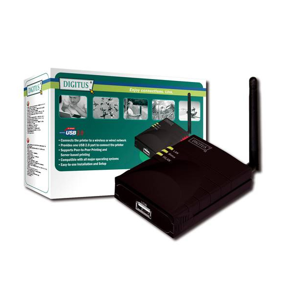 Wireless LAN print server, USB 2.0 - IEEE 802.3 / IEEE 802.3u Ethernet 10/100Mbps, IEEE 802.11g/b/n WLAN 150 Mbps, 1 x USB 2.0 A, 1 x RJ45, DHCP, TCP/IP, IPX/SPX, NetBEUI, AppleTalk, LPR, IPP, SMB/TCP, Raw Printing, Unix Logical