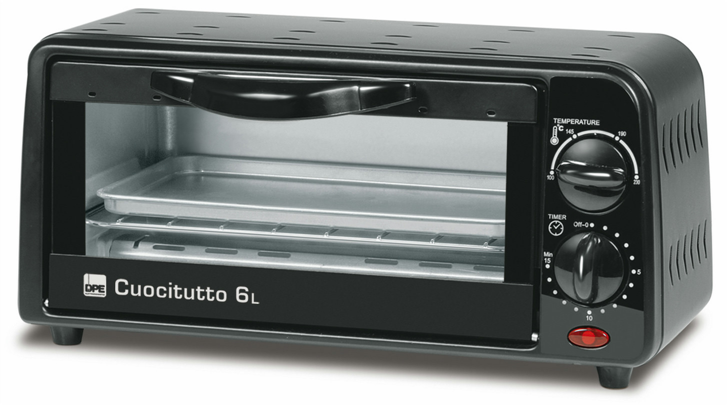 DPE Cuocitutto 6L. Ofentyp: Electric oven, Gesamtes Fassungsvermögen Garraum Ofen: 6 l, Innenkapazität des 1. Backofens: 6 l. Produktfarbe: Schwarz, Kontrolltyp: Rotation, Kontrollposition: Oben rechts. Timer-Typ: Mechanisch. Breite: 33 mm, Tiefe: 195 mm, Höhe: 165 mm
