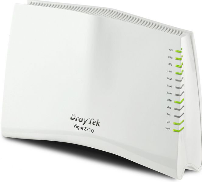 Draytek Vigor2710. Ethernet LAN Datentransferraten: 10,100 Mbit/s, Verkabelungstechnologie: 10/100Base-T(X). xDSL Anschluss: ADSL2+. Unterstützte Sicherheitsalgorithmen: 3DES,DES,HTTPS,MD5,SHA-1, Firewall: Multi-NAT, SPI, DoS. Produktfarbe: Weiß. Stromverbrauch (typisch): 6 W