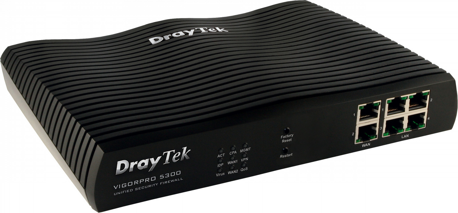 Draytek VigorPro 5300. Ethernet LAN Datentransferraten: 10,100 Mbit/s, Verkabelungstechnologie: 10/100Base-T(X). WAN Port: Ethernet (RJ-45). Router Protokoll: RIP-2. Unterstützte Sicherheitsalgorithmen: 3DES,DES,HTTPS,MD5,SHA-1, Firewall: CSM, VPN Unterstützung: PPTP, IPSec, L2TP, L2TP, IPSec. Produktfarbe: Schwarz