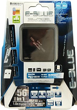 E-blue ERD029SL. Kompatible Speicherkarten: CF, Speicherstick (MS), miniSD, MMC, MS Duo, MS PRO, MS PRO Duo, SD, SDHC, xD. Kabellänge: 2,2 m. Datenübertragungsrate: 480 Mbit/s. Gewicht: 60 g. Abmessungen (BxTxH): 53 x 13 x 53 mm, Kompatible Betriebssysteme: Windows 2000/ME/NT/XP/Vista/7 Mac OS X 10.2 +