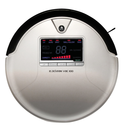 E.Zicom VAC 100. Staubkapazität (gesamt): 1 l, Produktfarbe: Silber, Display-Typ: LCD. Geräuschpegel: 65 dB, Integrierte Sensoren: Infrarotsensor. Batterietechnologie: Lithium, Batterielebensdauer: 1,35 h, Batterielebensdauer: 90 m². Durchmesser: 35 cm, Höhe: 100 mm, Gewicht: 4,5 kg