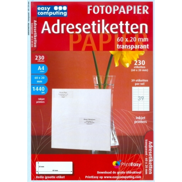 Easy Computing Adresetiketten transparant. Papiergröße: A4 (210×297 mm), Empfohlene Benutzung: Universal, Produktfarbe: Weiß