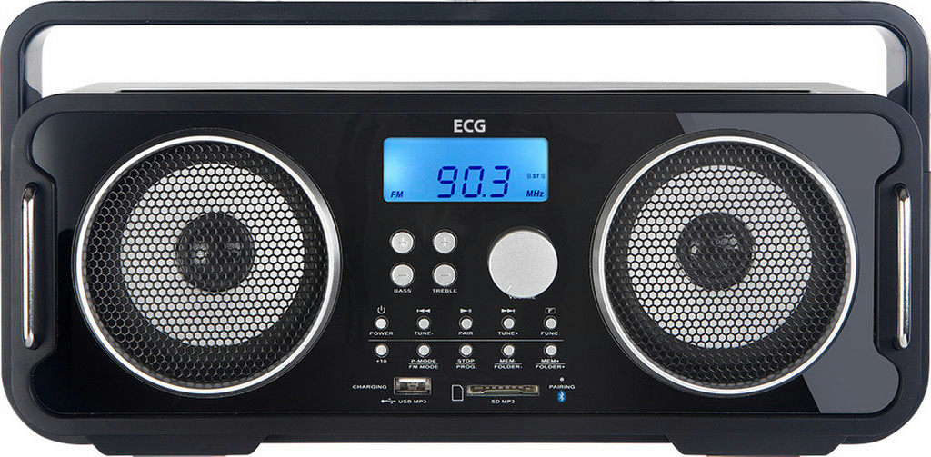 ECG BTR 1000. Radiotyp: Tragbar, Tunertyp: Digital, Unterstützte Bänder: FM. Musikleistung, gesamt: 5 W. Farbe der Hintergrundbeleuchtung: Blau. Breite: 41,7 cm, Tiefe: 14,3 cm, Höhe: 19,3 cm. Batteriekapazität: 2100 mAh, Batteriespannung: 3,7 V