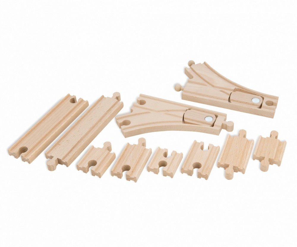 Mit dem Eichhorn Bahn Set ""Ausgleichsschienen"" wird jede Lücke im fast fertigen Schienensystem geschlossen. Dafür stehen im Set 2 gerade Schienen, 6 kurze gerade Scheinen und zwei verstellbare Weichen zur Verfügung. Die langen und kurzen Schienen gibt es jeweils auch mit 2 Löchern oder 2 Nasen. Für die Herstellung der Eichhorn Schienenbahn wird ausschließlich FSC ® 100% Holz aus nachhaltiger Forstwirtschaft verwendet. Für Kinder ab 3 Jahren geeignet.