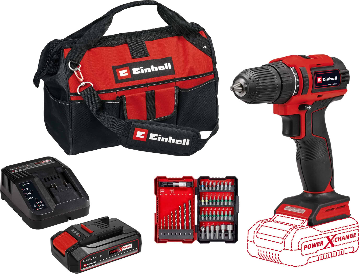 Lieferumfang: Schnellspannbohrfutter, Bohrer-Set, Schnellladegerät