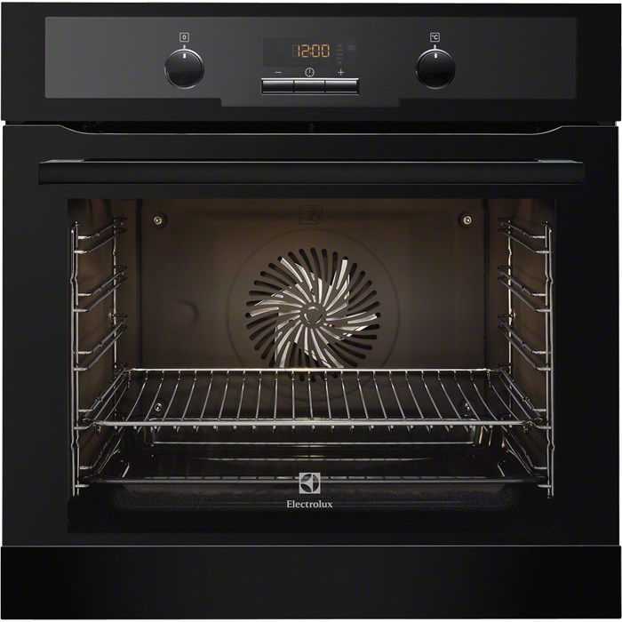 Electrolux EOA55551AK. Ofengröße: Medium, Ofentyp: Electric oven, Gesamtes Fassungsvermögen Garraum Ofen: 74 l. Produktfarbe: Schwarz, Kontrolltyp: Rotation, Kontrollposition: Vorderseite. Energie-Effizienzklasse: A, Energieverbrauch (konventionell): 0,99 kWh, Energieverbrauch (erzwungene Konvektion): 0,88 kWh. Breite: 594 mm, Tiefe: 567 mm, Höhe: 594 mm
