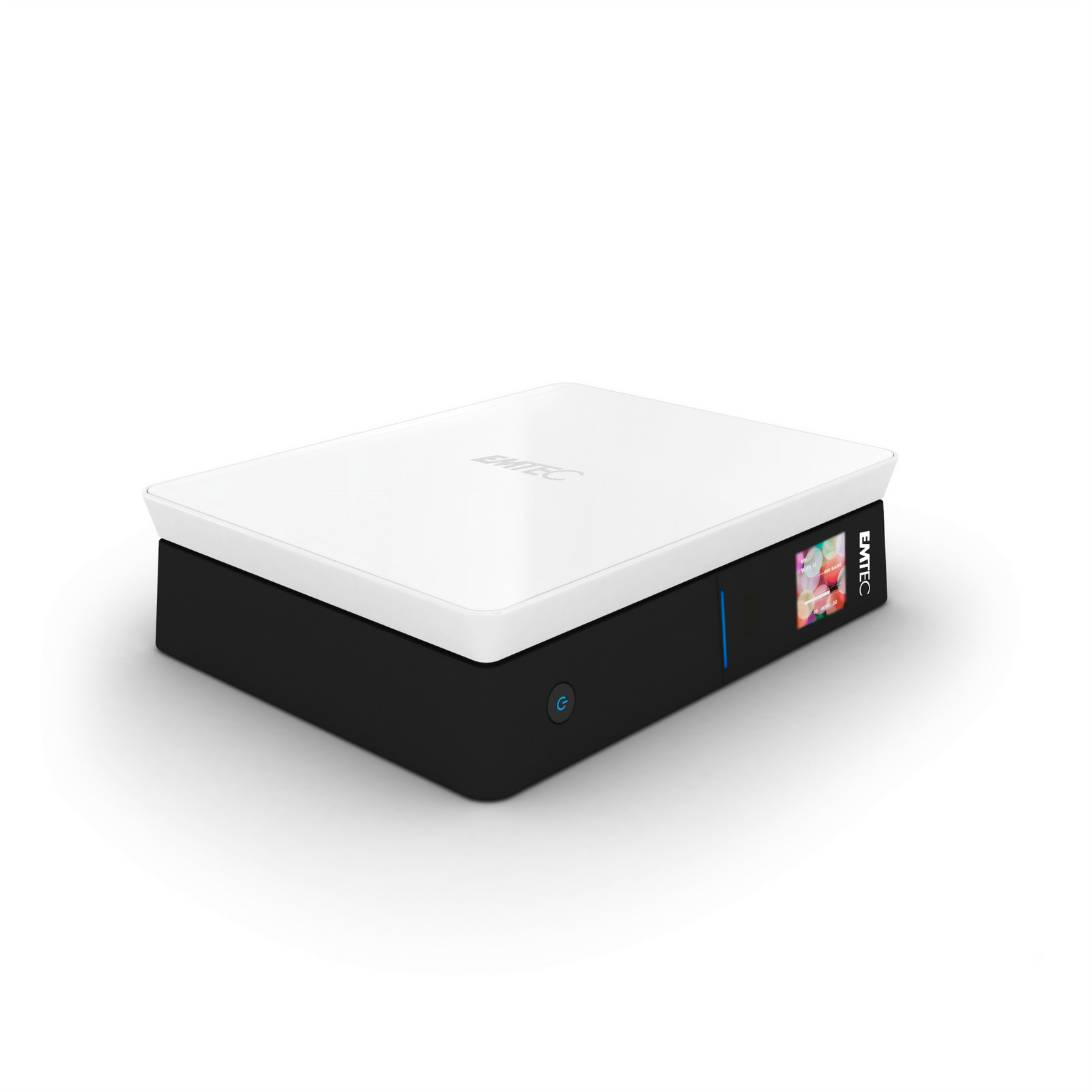 Emtec Movie Cube S800, 1000GB. Produktfarbe: Schwarz, Weiß. Speichermedien Typ: Festplatte, Gesamtspeicherkapazität: 1000 GB, Speicherlaufwerk Schnittstelle: SATA. Unterstützte Videoformate: AVI,DAT,IFO,MPEG2,MPG,TS,VOB, Unterstützte Bildformate: BMP,JPG, Videokompressionsformate: AVI,DAT,MP4,VOB,XVID. Ethernet LAN Datentransferraten: 10,100 Mbit/s. Stromverbrauch (typisch): 35 W, AC Eingangsspannung: 100 - 240 V, AC Eingangsfrequenz: 50/60 Hz