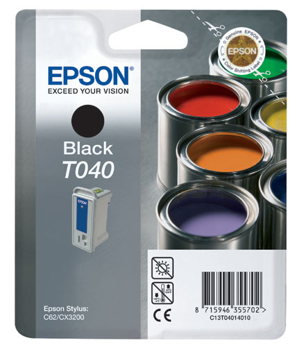 Epson T040. Druckfarben: Schwarz, Kompatible Produkte: - Epson Stylus C62 - Epson Stylus CX3200, Drucktechnologie: Tintenstrahl