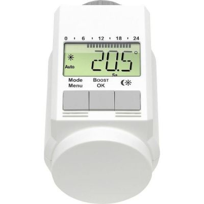 Elektronik-Heizkörperthermostat mit vorprogrammiertem, individuell einstellbarem Heiz- und Absenkprogramm für zeitgesteuerte Regelung der Raumtemperatur.