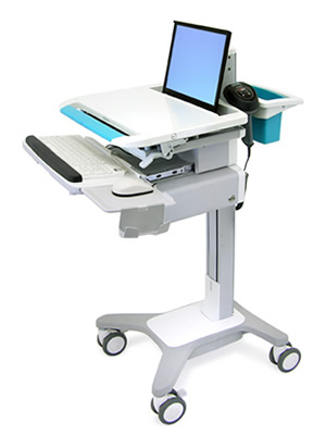 Dieser innovative, ergonomische und leicht zu handhabende medizinische Computerwagen verfügt über eine sichere Notebook-Befestigung, eine Höhenverstellfunktion für das Arbeiten im Sitzen oder Stehen sowie eine einstellbare, negativ neigbare Tastaturablage. Dank unserer langjährigen Erfahrung und fachlichen Zusammenarbeit im Bereich Point-of-Care Computing ist es uns gelungen, einen Computerwagen zu entwickeln, der nicht nur den Ansprüchen des Pflegepersonals gerecht wird, sondern auch in Sachen IT, Infektionsschutz und Kosteneffizienz keine Wünsche offen lässt!