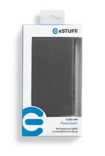 eSTUFF ES80196. Produktfarbe: Grau, Aufladekompatibilität: Universal. Batteriekapazität: 4000 mAh, Ausgangsspannung: 5 V, Outputstrom: 1 A. Mitgelieferte Kabel: Micro-USB