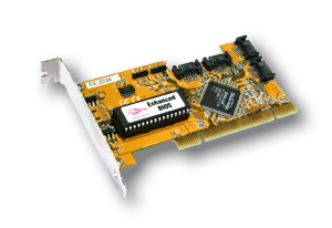 Höhe von 8cm. Er unterstützt RAID 0 (Stripping), RAID 1 (Mirroring), RAID 0+1. Der EX-3336-L hat vier interne Serial-ATA Ausgänge für bis zu vier Serial-ATA Festplatten. Optional mit dem EX-3341 Slotkabel, besteht die Möglichkeit zwei Serial-ATA Ausgänge nach außen zu führen. Es wird Software Treiber und RAID KIT mitgeliefert. Der EX-3336-L ist die richtige Lösung um S-ATA Geräte an einen PCI Slot anzuschließen.