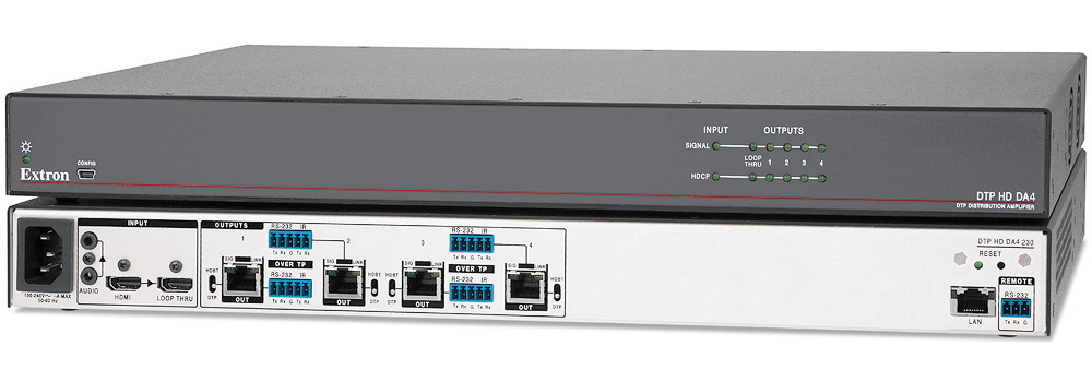 Extron DTP HD DA4 230. AC Eingangsspannung: 100-240 V, AC Eingangsfrequenz: 50/60 Hz, Stromverbrauch (typisch): 45,6 W. Abmessungen (BxTxH): 444 x 216 x 44 mm, Gewicht: 2,2 kg. Verpackungsabmessungen (BxTxH): 356 x 559 x 114 mm, Paketgewicht: 2,27 kg