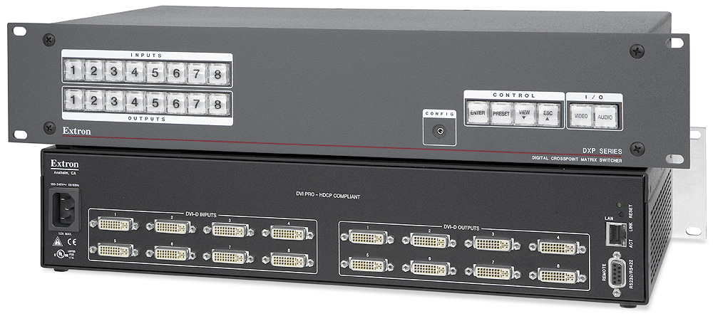 Extron DXP 84 DVI PRO. Abmessungen (BxTxH): 444 x 305 x 89 mm. Netzteil Eingansgsspannung: 100 - 240 V, Netzteilfrequenz: 50/60 Hz